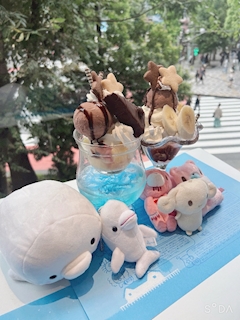 こんばんはりいです🌙 しゅっきんしました❗️ このあいだ友達と東口のパフェ食べにいってきました🌟 ずっと行ってみたいって思ってたからうれしかった(๑・̑◡・̑๑) かわいいぬいぐるみたち並べて写真撮った🐬🤍🤍 かわいくておいしいもの食べて元気チャージできたので今日もがんばりますo(^▽^)o